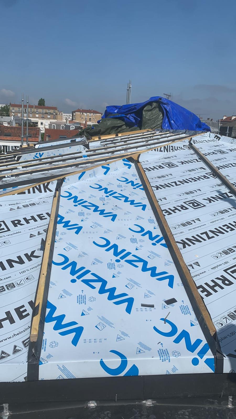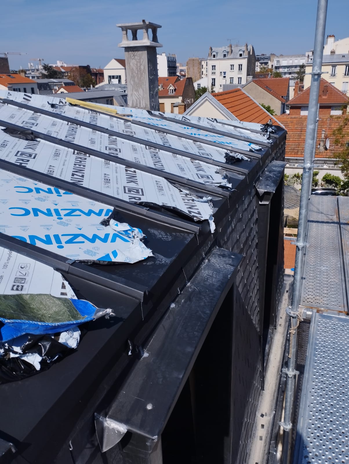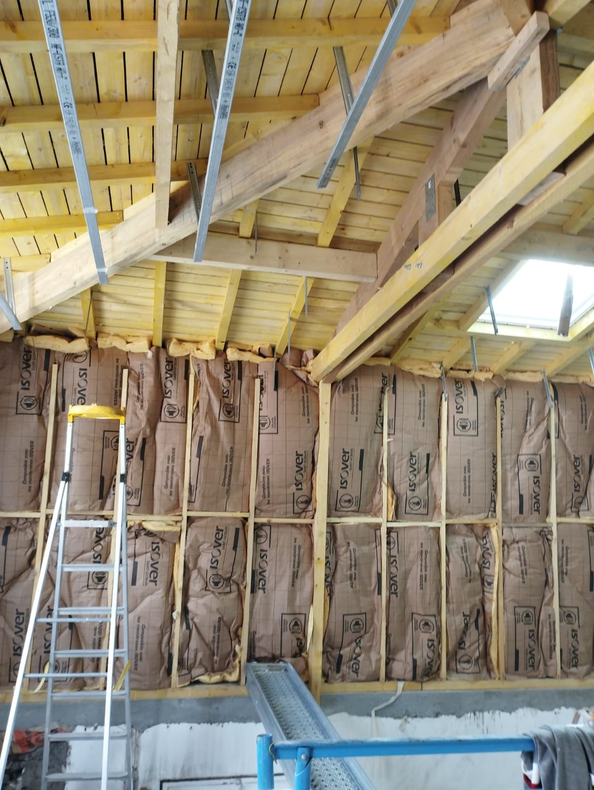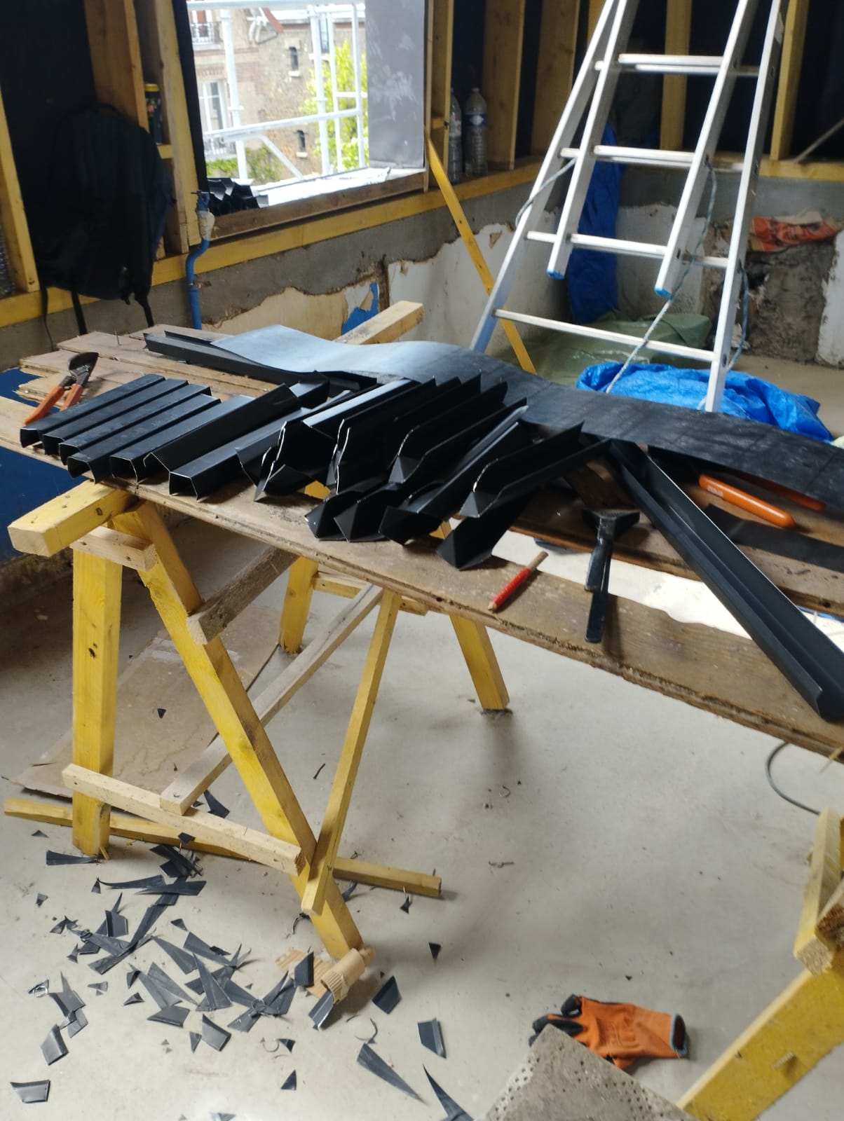 – Création d’une charpente associant une couverture en zinc prépatiné, brisis en ardoise agrémenté de lucarnes renforçant le charme et l’authenticité du projet.